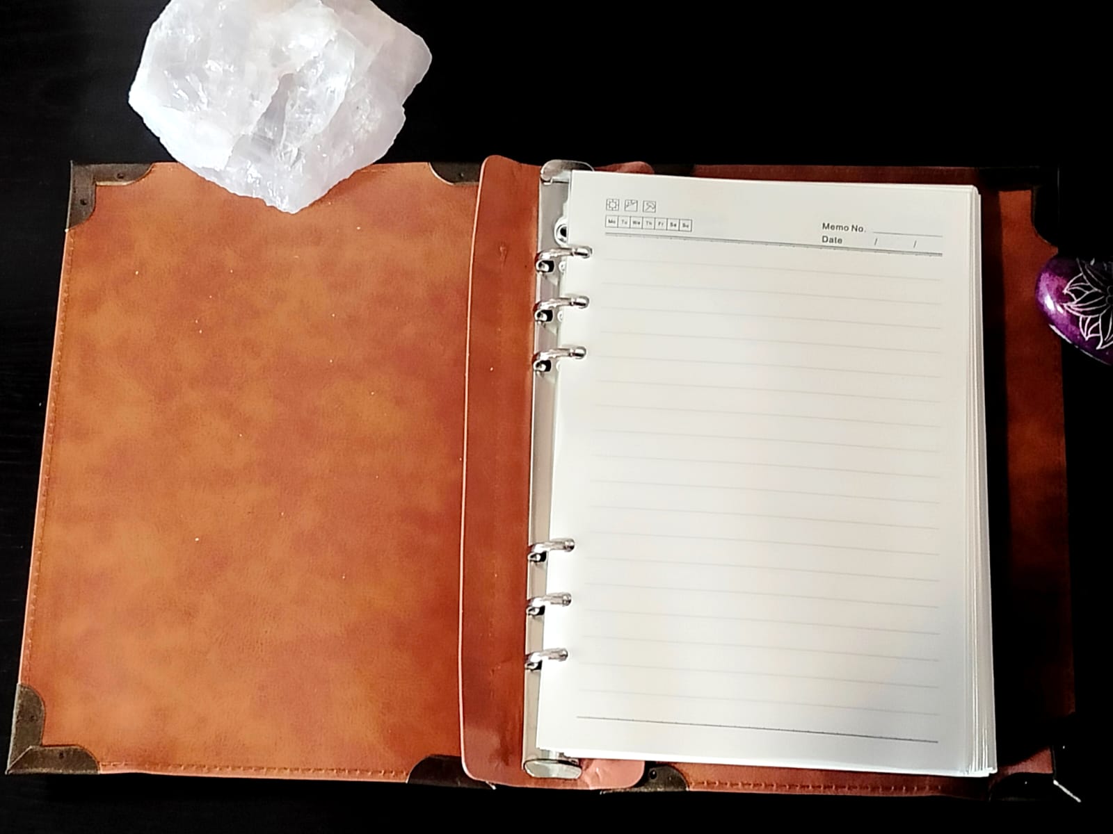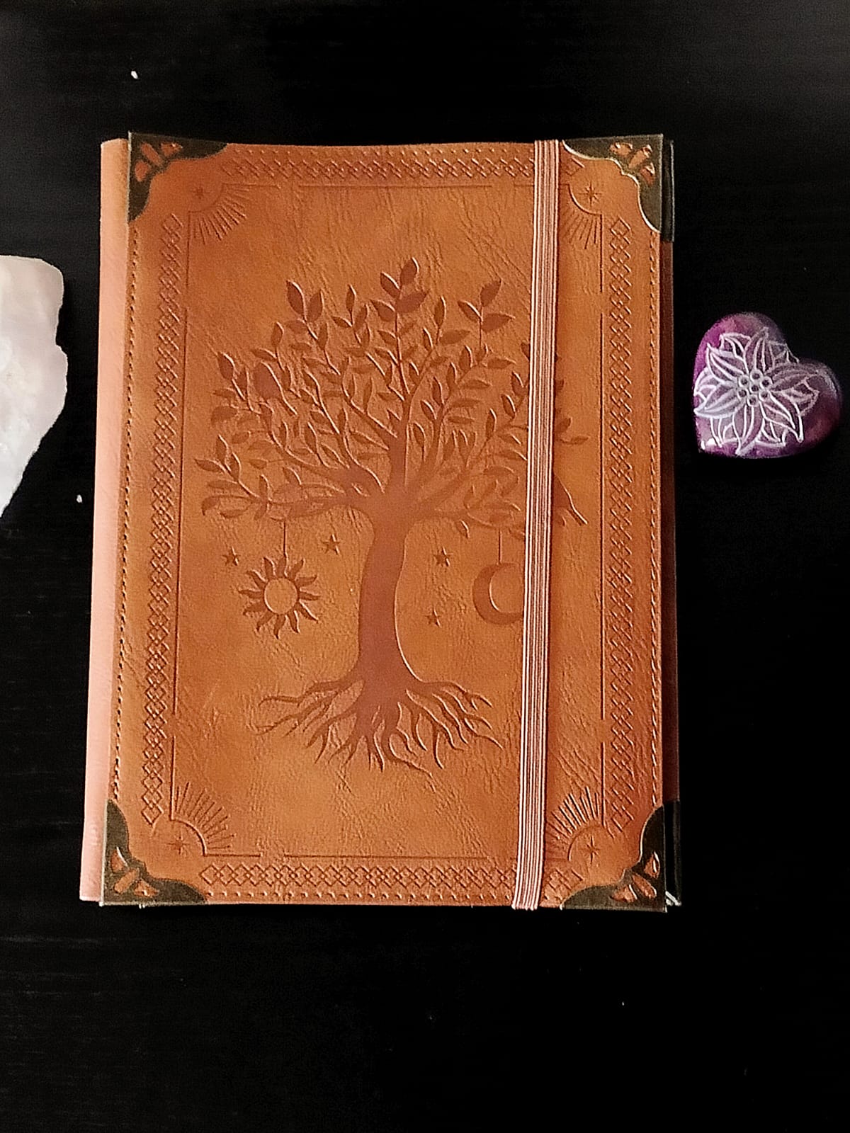 Agenda/Diario Albero della Vita – Elegante e simbolico, realizzato in semilpelle con angoli in metallo decorativi. Interno ad anelli per la massima praticità, misura circa 24/25 cm. Perfetto per custodire appunti, pensieri e progetti con un tocco di classe.