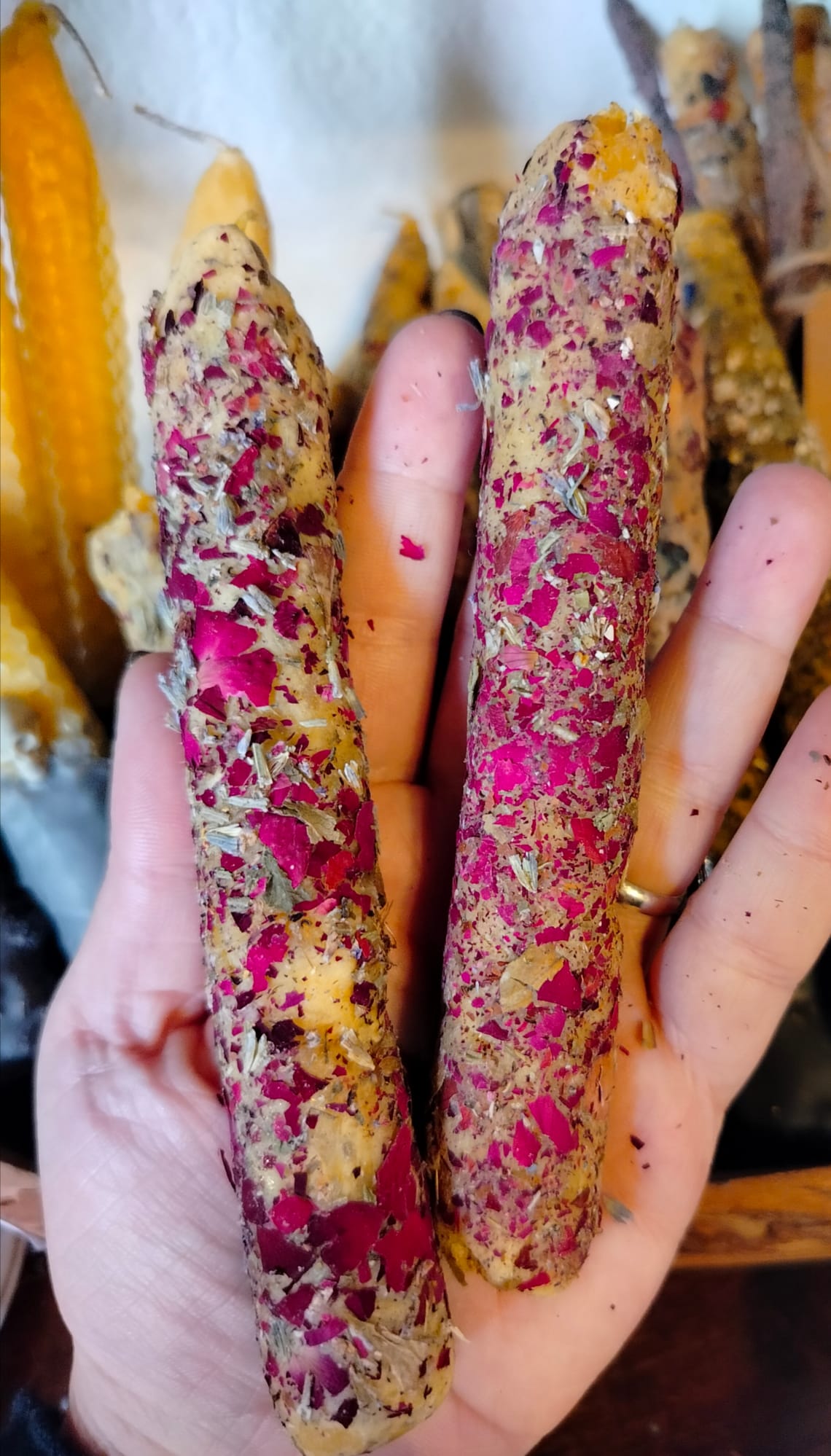 Candela creata artigianalmente con cera d’api, petali di rosa e lavanda, altezza circa 15 cm.