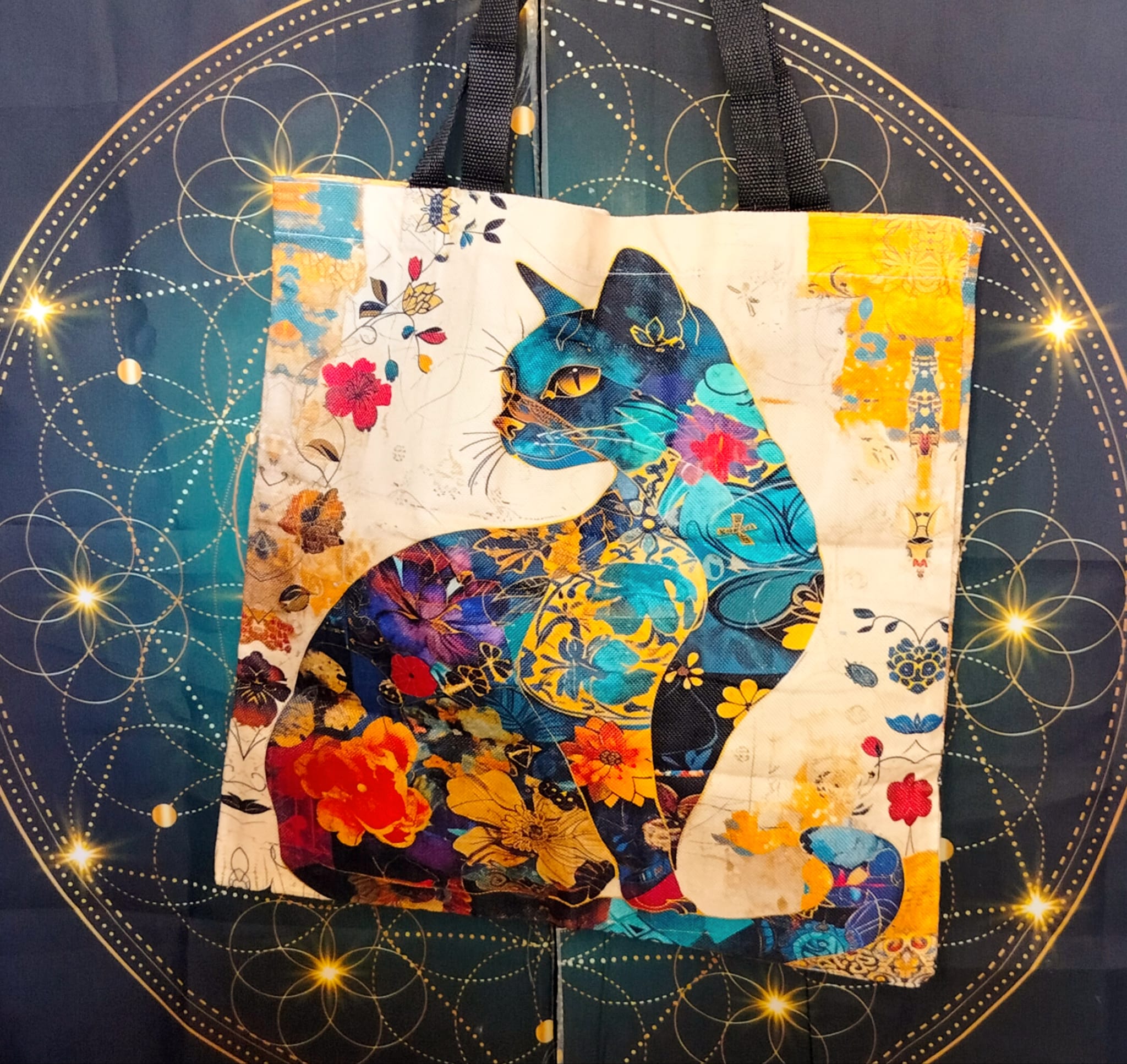 Coloratissima bag in tessuto con gatto stilizzato, grande circa 40/45 cm, molto capiente. Non è dotata di chiusura, ma è predisposta.