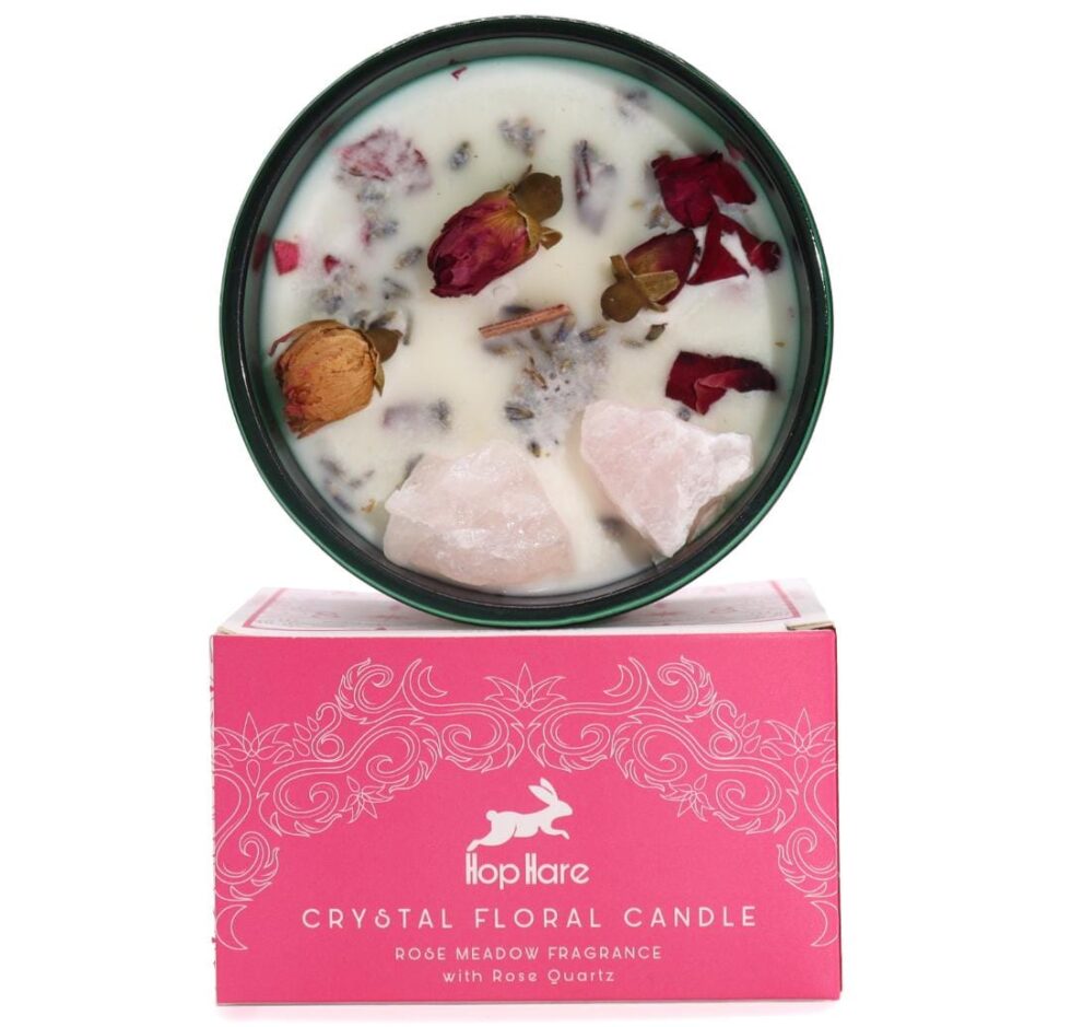 Racchiusa in un elegante vetro verde con stoppino in legno rustico, ogni candela di cristallo Hop Hare è un piccolo rituale di bellezza. Al suo interno, frammenti di quarzo rosa e fiori secchi completano l’incanto visivo e energetico.