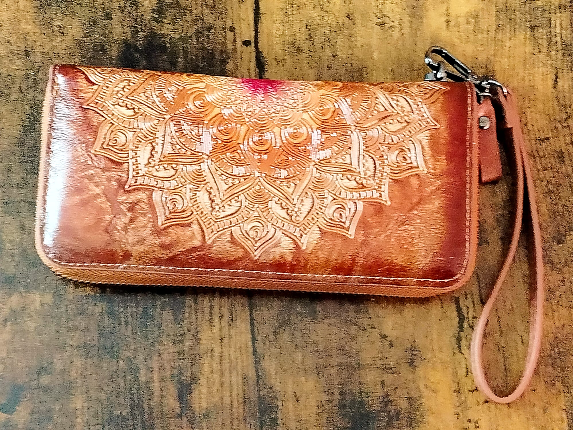 Portafoglio in similpelle rettangolare con disegno di un mandala su entrambi i lati.